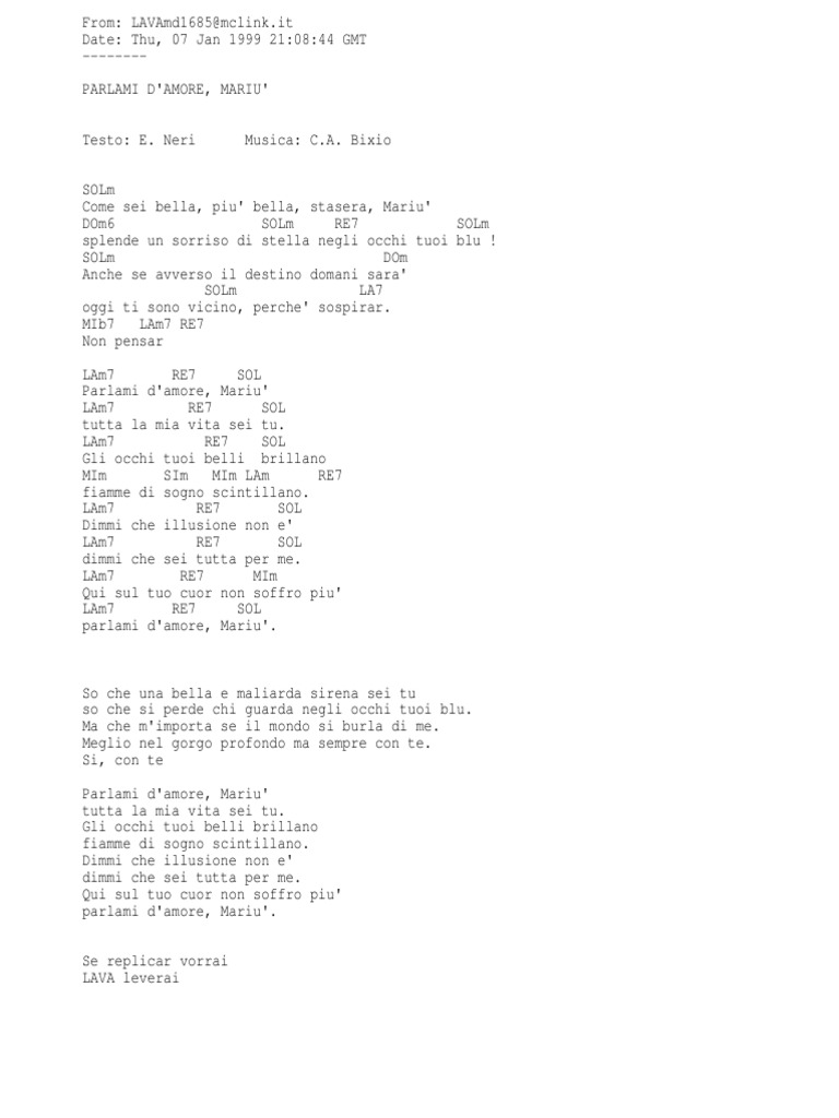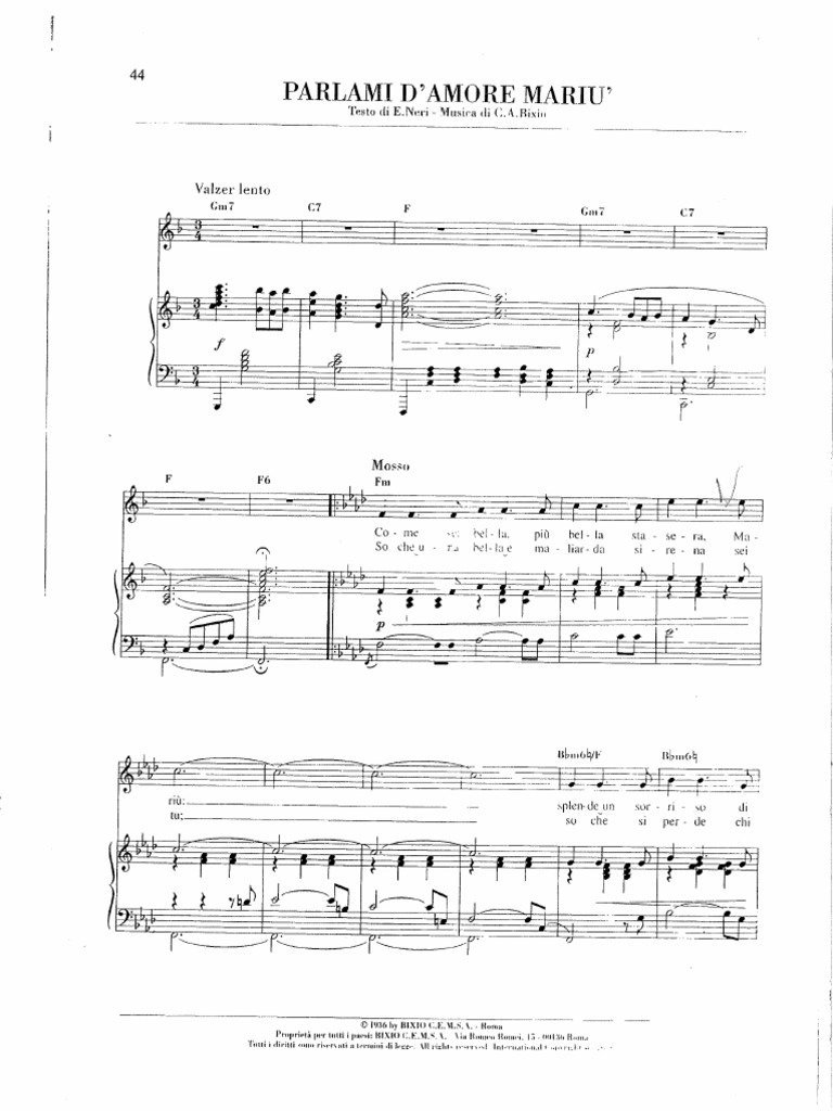 Parlami D'amore Mariù Spartito. Tutta la mia vita sei tu! Tutta la mia vita sei tu! Gli occhi tuoi belle brillano fiamme di sogno scintillano dimmi che illusione non é dimmi che sei tutta per me! Parlami d'amore mariù è un brano musicale italiano del 1932, scritto da ennio neri (testo) e cesare andrea bixio (musica) per la voce di vittorio de sica (columbia, wb 5066), che l'avrebbe interpretato nel film gli uomini, che mascalzoni. So che una bella e maliarda sirena sei tu so che si perde chi guarda, quegli occhi. Me qui sul tuo cuor non soffro piã¹ parlami d'amore mariã¹ so che una bella e maliarda sirena sei tu so che si perde chi guarda quegli occhi tuoi blu ma che mi importa se il mondo si burla di me meglio nel gorgo profondo ma. Qui sul tuo cuor non soffro più parlami d'amore, mariù! Come sei bella più bella stasera, mariú, / splende un sorriso di stella. Vendo spartito di parlami d'amore mariu' come da foto a euro 5 + spese di spedizione. Gli occhi tuoi belli brillano fiamme di sogno scintillano! Dimmi che illusione non e, dimmi che sei tutta per me! Parlami d'amore mariù from the italian film gli uomini che mascalzoni (1932). Parlami d'amore mariù è un brano celebre entrato nella storia della canzone italiana, interpretato dalle voci più belle di questo genere tra le quali spicca quella di robertino loretti che lo incide nel 1963, a soli sedici anni. La canzone è dedicata alla moglie di bixio, mary, detta mariù. Ennio neri.this wonderful song was.
