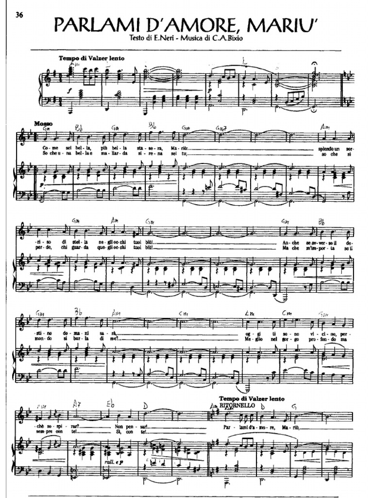 Digitized from a shellac record, at 78 revolutions per minute. Gli occhi tuoi belle brillano fiamme di sogno scintillano dimmi che illusione non é dimmi che sei tutta per me! Parlami d'amore mariù è un brano musicale italiano del 1932, scritto da ennio neri (testo) e cesare andrea bixio (musica) per la voce di vittorio de sica (columbia, wb 5066), che l'avrebbe interpretato nel film gli uomini, che mascalzoni. From the album little italy hits of the 50's, vol. So che una bella e maliarda sirena sei tu so che si perde. Tutta la mia vita sei tu! Download and print in pdf or midi free sheet music for parlami damore mariù by achille togliani arranged by rodrigogastongarciaestol for piano (solo).